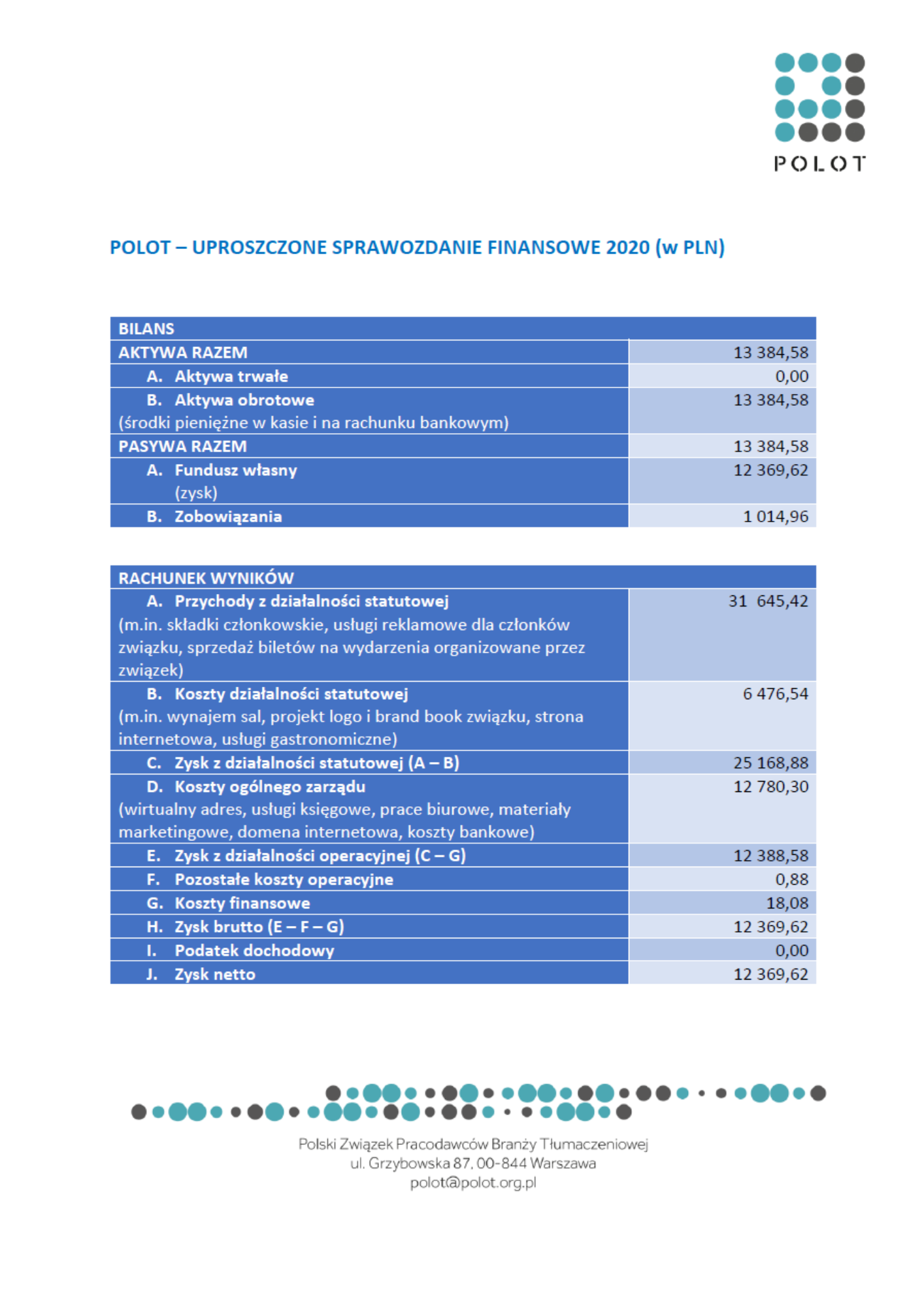W trosce o przejrzystość finansową poniższe sprawozdanie finansowe POLOT zostało uproszczone i przetworzone, aby uczynić je bardziej czytelnym i ułatwić Państwu zorientowanie się, na co wydatkowane były środki finansowe i jakie były źródła finansowania Związku w roku 2020.